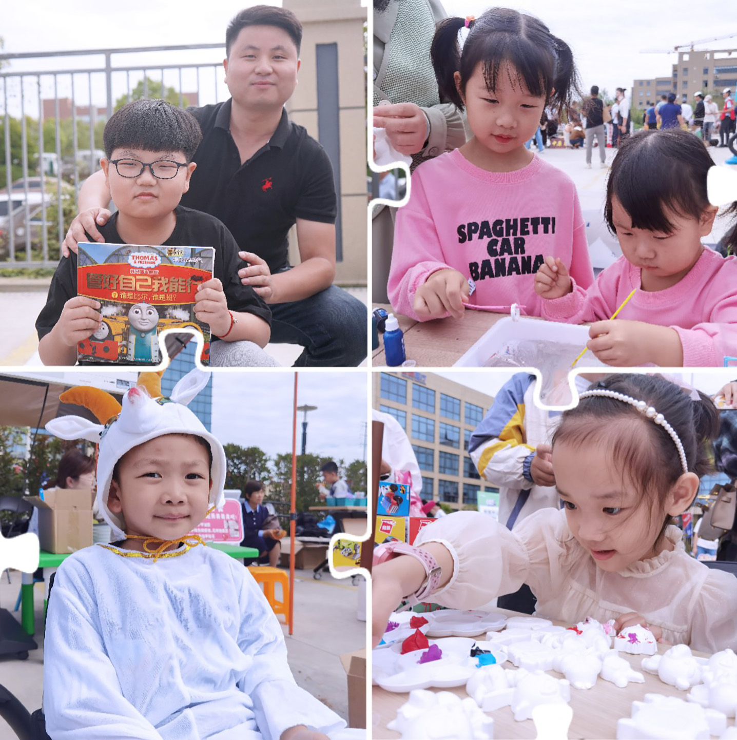 四年級(jí)的薛宇凡帶來了各種自己看過的書籍;一年級(jí)的劉雨桐在售賣DIY陶瓷娃娃;幼兒園中班的徐易辰穿著綿羊服在推銷自己的萌寵……