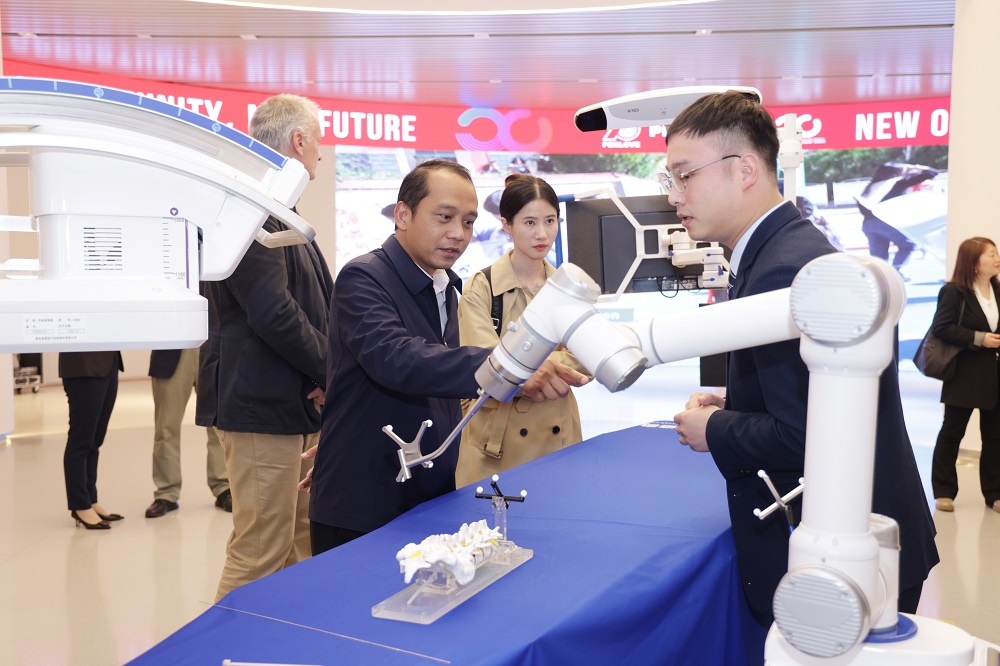 普愛醫(yī)療國際市場經(jīng)理陪同代表團參觀了公司多款創(chuàng)新產(chǎn)品,重點操作展示了“脊柱外科手術導航定位系統(tǒng)”。