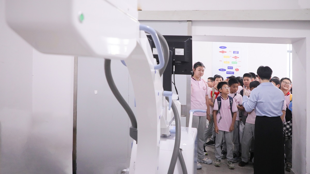 為了向同學(xué)們更直觀地展示醫(yī)療設(shè)備誕生的過程,理解科技發(fā)展為人類疾病的精準(zhǔn)診療發(fā)揮著怎樣的價值,工作人員特別安排同學(xué)們參觀生產(chǎn)調(diào)試車間。見證一臺影像設(shè)備從安裝、調(diào)試到可以拍攝影像的完整流程。